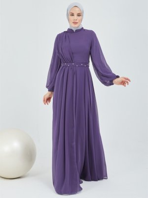 Olcay Açık Mor Kemeri Taş Ve İnci Süslemeli Şifon Detaylı Abiye Elbise
