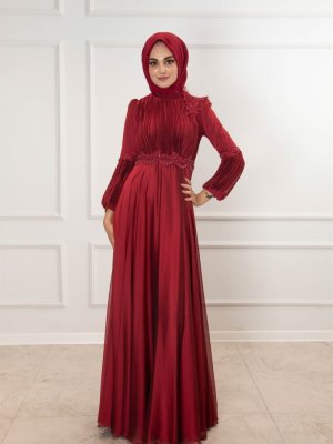 Egelin Bordo Otriş Detaylı Drapeli Şifon Abiye Elbise
