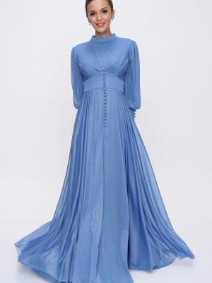 Saygı Giyim İndigo Düğme Detaylı Simli Uzun Abiye Elbise