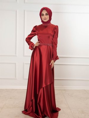 Egelin Bordo Bilek Detaylı Hareketli Etek Saten Abiye Elbise