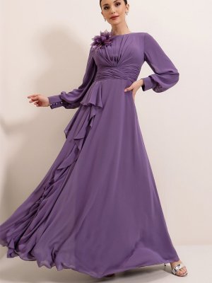 Saygı Giyim Lila Önü Çiçek Detaylı Pileli Yanı Volanlı Astarlı Uzun Şifon Abiye Elbise