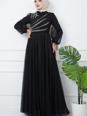 Olcay Siyah Önü Volan Ve Taş Detaylı Tüllü Abiye Elbise