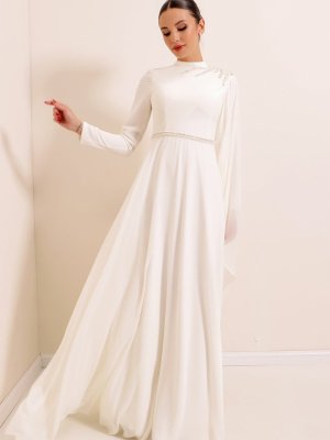 Saygı Giyim Ekru Omuz Ve Bel Boncuk Detaylı Astarlı Şifon Uzun Abiye Elbise