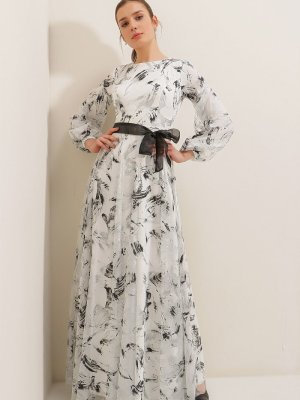 Saygı Giyim Beyaz Gümüş Beli Kuşaklı Astarlı Desenli Uzun Tül Abiye Elbise