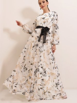 Saygı Giyim Krem Gold Beli Kuşaklı Astarlı Desenli Uzun Tül Abiye Elbise