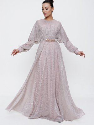 Saygı Giyim Pudra Beli Boncuk Detaylı Kuşaklı Astarlı Simli Uzun Abiye Elbise