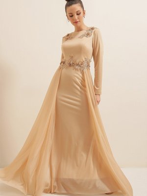 Saygı Giyim Gold Yakası Beli Çiçekli Simli Abiye Elbise