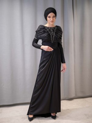 Egelin Siyah Taşlı Drape Yaka Detaylı Saten Abiye Elbise