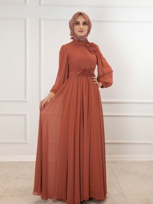 Egelin Kiremit Üç Boyutlu Çiçek Detay Balon Kol Şifon Abiye Elbise