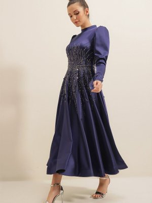 Saygı Giyim Lacivert Boncuk Ve Boyut Çiçek Detaylı Cepli Uzun Saten Abiye Elbise