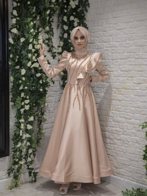 Egelin Bakır Balon Kol Ve Fırfırlı Saten Vizon Abiye Elbise