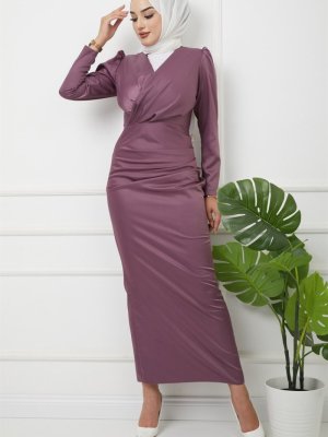 Olcay K. Lila V Yaka Pile Detaylı Saten Abiye Elbise