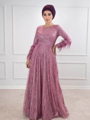 Egelin Pembe Kolları Tüy Detaylı Simli Abiye Elbise