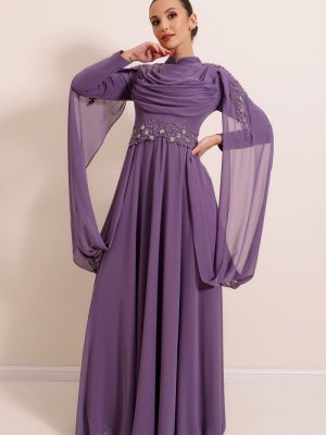 Saygı Giyim Lila Aplik İşleme Detaylı Astarlı Şifon Abiye Elbise