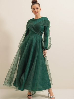 Saygı Giyim Zümrüt Puanlı Kolları Bağcıklı Astarlı Uzun Tül Abiye Elbise