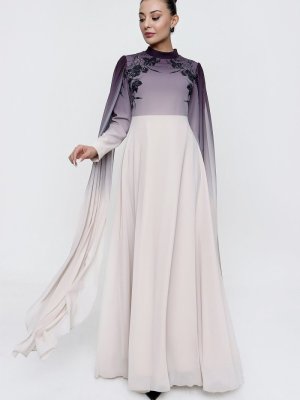 Saygı Giyim Bej Üstü Boncuklu Gül Desenli Omuzları Uzun Tüllü Astarlı Abiye Elbise