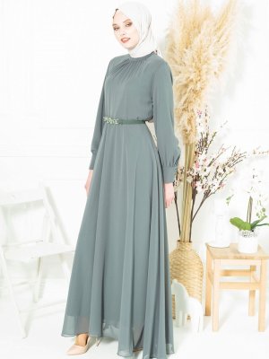 Beyza Haki Halka Kemerli Şifon Abiye Elbise