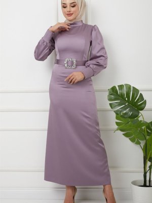 Olcay Açık Lila Kolu Büzgü Detaylı Taşlı Tokalı Saten Abiye Elbise