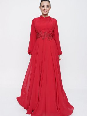 Saygı Giyim Kırmızı Üstü Pileli Beli Boncuk Güpür Detaylı Astarlı Uzun Şifon Abiye Elbise