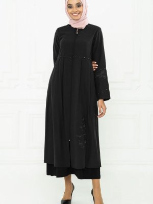 Beyza Siyah Belde Pile Ve Nakış Detaylı Ferace