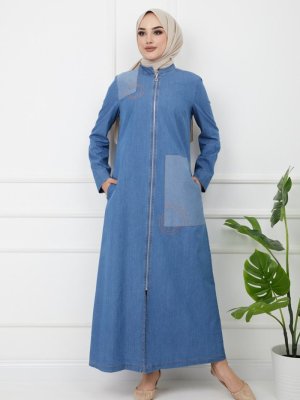 Olcay Mavi İşleme Detaylı Fermuarlı Astarsız Kot Ferace