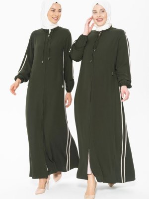 Beyza Haki / Bej Fermuarlı Şeritli Ferace