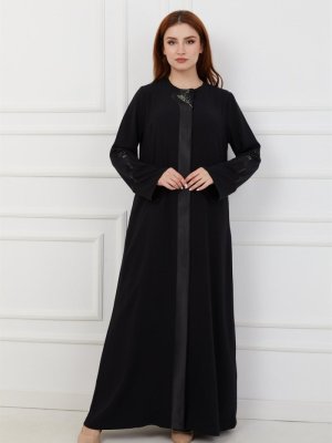 Olcay Siyah Saten Ve Taş Detaylı Astarsız Ferace