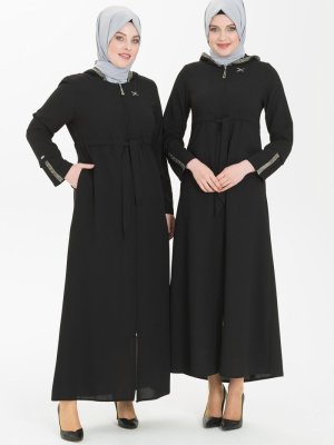 Beyza Siyah Kapüşonlu Taş Şeritli Ferace