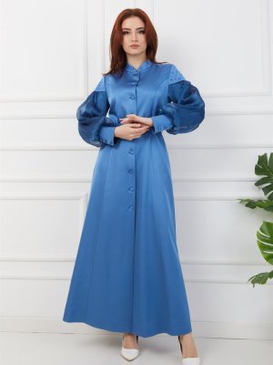 Olcay Mavi Taş Ve Şifon Detaylı Astarlı Abiye Pardesü