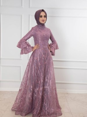Egelin Lila Hakim Yaka Kolları Volanlı Abiye Elbise