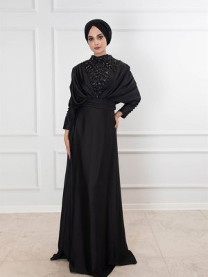 Egelin Siyah Gövde Taş İşleme Omuzdan Drapeli Bilek Düğmeli Abiye Elbise