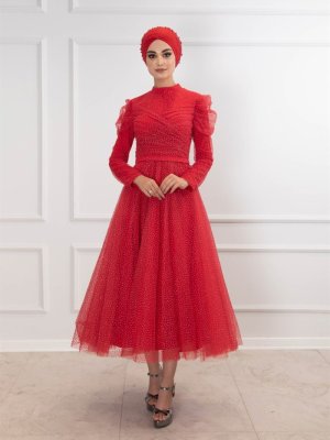 Egelin Kırmızı Puantiye Ve Tüllü Midi Abiye Elbise