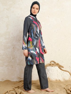 Mayo Bella Fırça Desenli Tam Kapalı Mayo Antrasit