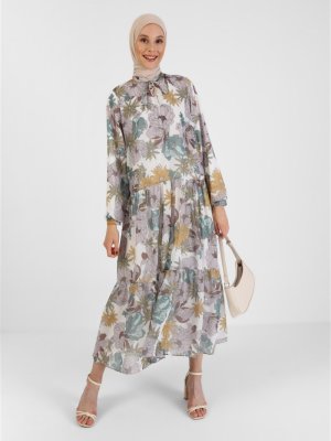 Refka Yeşil Hardal Çiçekli Bağlama Detaylı Astarlı Şifon Elbise