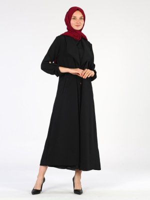 Tekbir Siyah Tekbir Bel Büzgülü Uzun Ceket