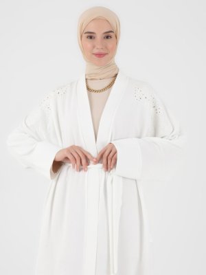 Refka Off White Nakış Detaylı Kuşaklı Kimono