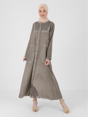 Çıkrıkçı Bej Boydan Düğmeli Güpür Detaylı Ferace