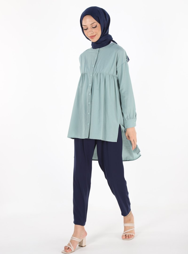 PLİSTRE Su Yeşili Arkası Uzun Gömlek