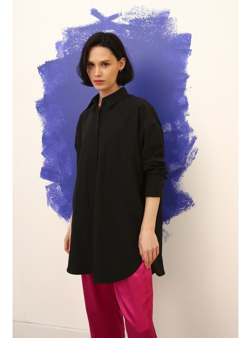 Allday Siyah Kolları Pliseli Arkası Uzun Cepli Gömlek Tunik