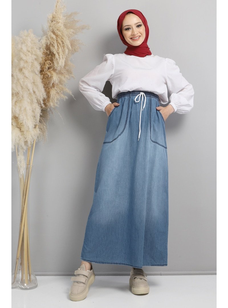 Tesettür Dünyası Beli Lastikli Kot Etek Açık Mavi