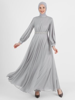 Refka Gri Beli Nakış Detaylı Simli Abiye Elbise
