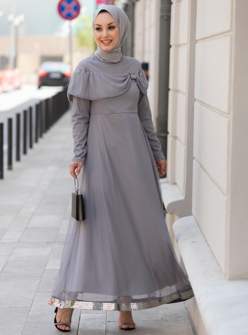 Tofisa Gri Ete Ucu Detaylı Abiye Elbise