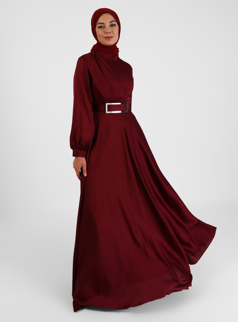 BÜRÜN Bordo Kemerli Abiye Elbise