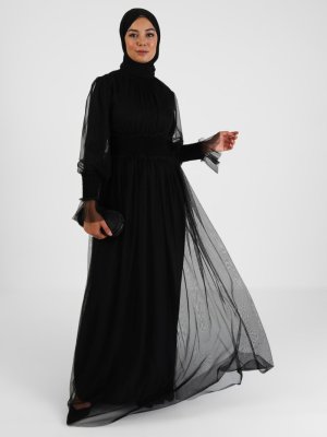 Tavin Siyah Bel Ve Kol Uçları Gipe Detaylı Abiye Elbise