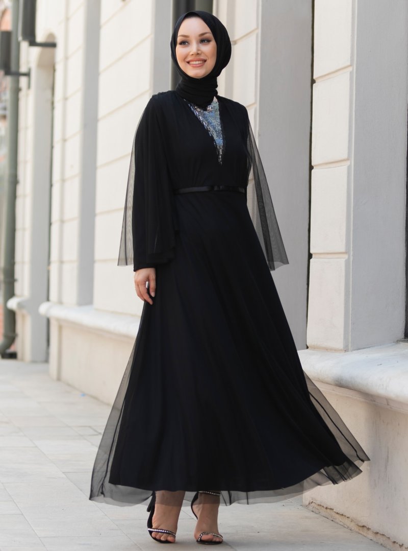 Tofisa Siyah Tül Detaylı Abiye Elbise