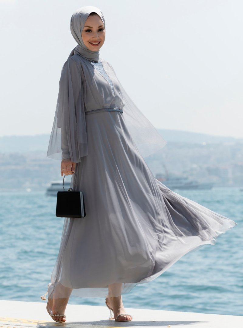 Tofisa Gri Tül Detaylı Abiye Elbise