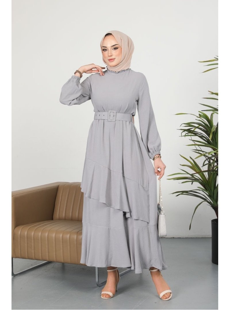 Bestenur Gri Eteği Katlı Fırfır Yaka Detaylı Ayrobin Elbise