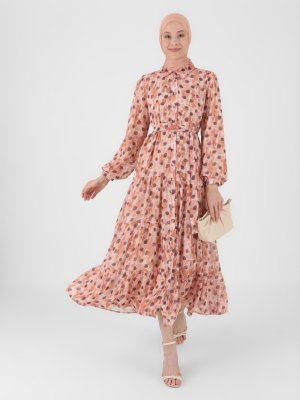 Refka Pudra Kahverengi Puantiye Desenli Şifon Elbise