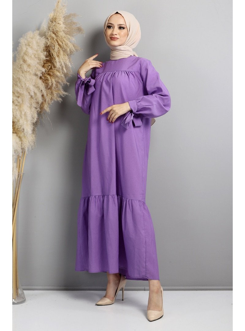 Tesettür Dünyası Lila Kol Ucu Bağlamalı Elbise
