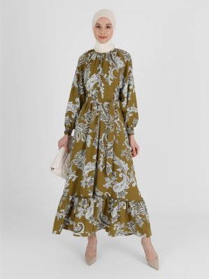 Refka Yeşil Şal Desenli Kol Uçları Gipe Detaylı Saten Elbise